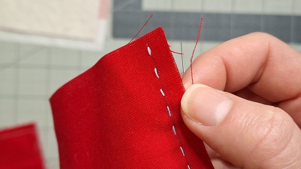 The coaster begins with piecing two pairs of 2 1/2 inch squares, pressing, and then joining them to form the classic four-patch block. Once the block is complete, it’s layered with batting and background fabric and stitched into a finished coaster.