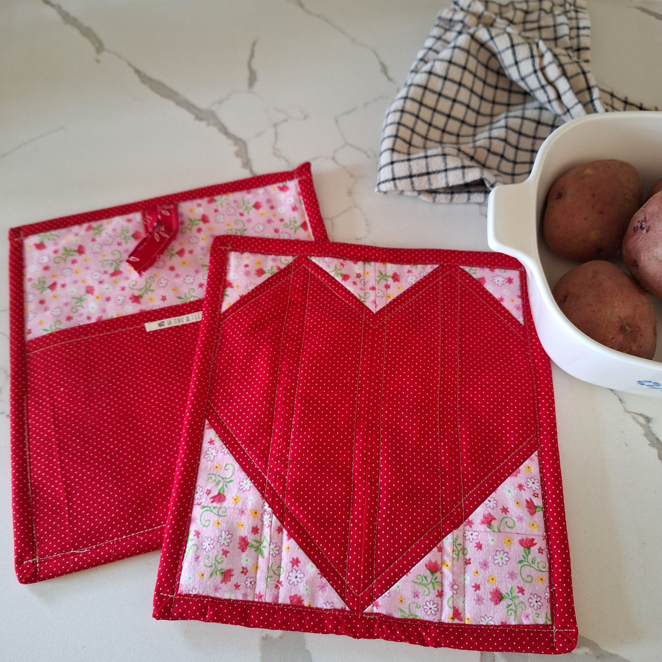 The Heart-shaped Potholder set makes and excellent thoughtful gift for your favorite cooking enthusiast. Customize the potholders for your favorite sports team, personal interest or design style. The pattern is a great scrap buster or can be used with fat quarters, jelly roll strips or fat eighth bundles and is perfect for the beginner sewist or quilter. If you've sewn anything before you can make this potholder set- just add heat reflective batting- don't worry, I'll explain it all! This downloadable PDF pattern guides you through the creation of a set of two potholders with tabs and pockets measuring 9.5in. (24cm) long by 8.5in. (22cm) wide.